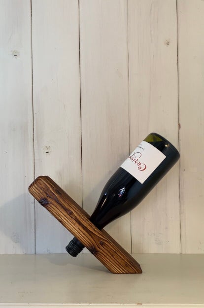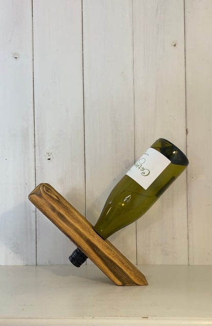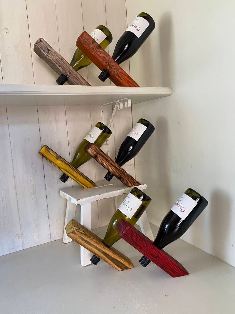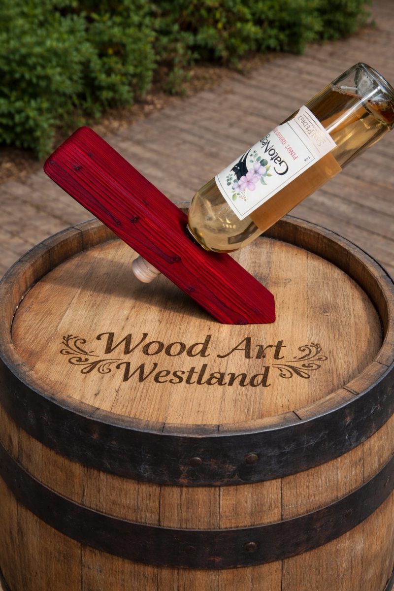 Een handgemaakte houten standaard voor een wijnfles, beschikbaar in diverse kleuren. Perfect om uw favoriete wijn op een stijlvolle manier te presenteren.